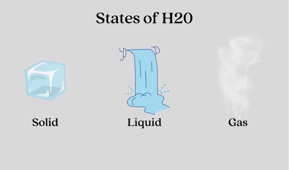 The behavior of H2O varies in each of these states. When water is liquid, it flows; when it is solid, it is frozen.