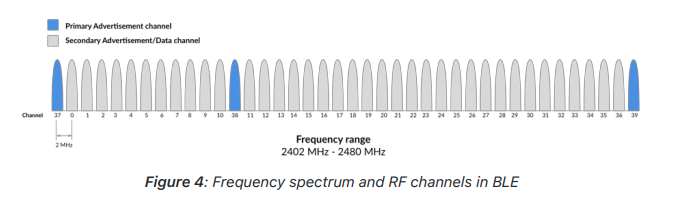A Bluetooth LE radio hardware must operate in the ISM band (2.4 GHz spectrum), which is segmented into 40 RF channels, each separated by 2 MHz (center-to-center), as shown in the following figure: