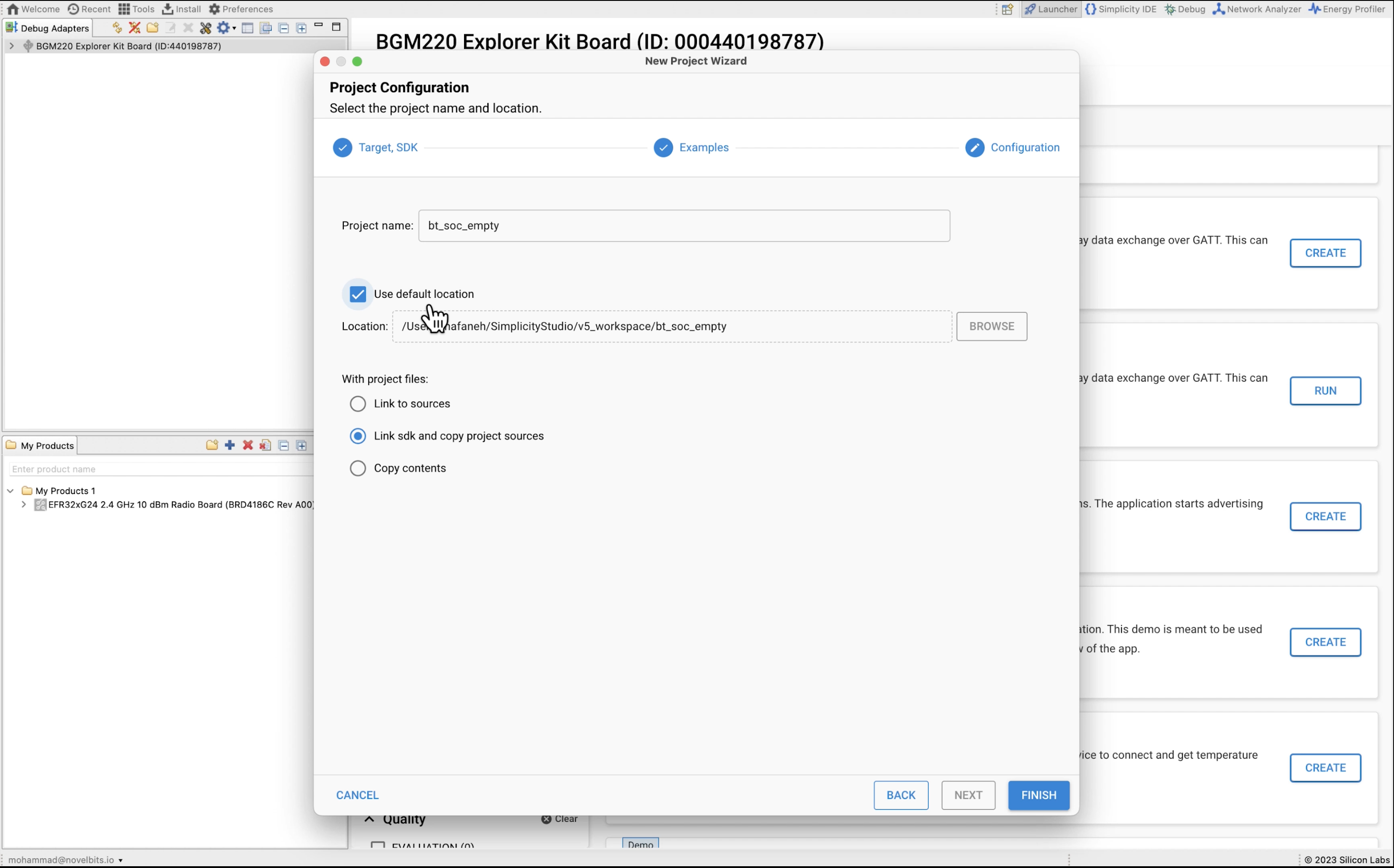 Next, we want to create a project based on the SoC Empty example. Hit create and set a name for your project: