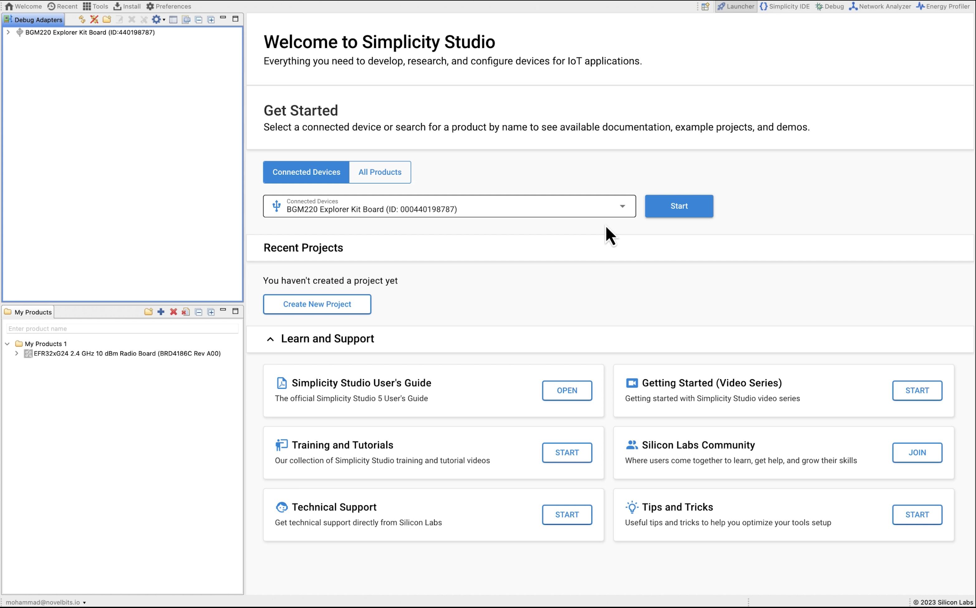 Once you have Simplicity Studio downloaded, connect the BG22 Explorer Kit to your computer. Now, navigate to the Launch perspective and it should now show up there under Connected Devices. Then, hit Start.