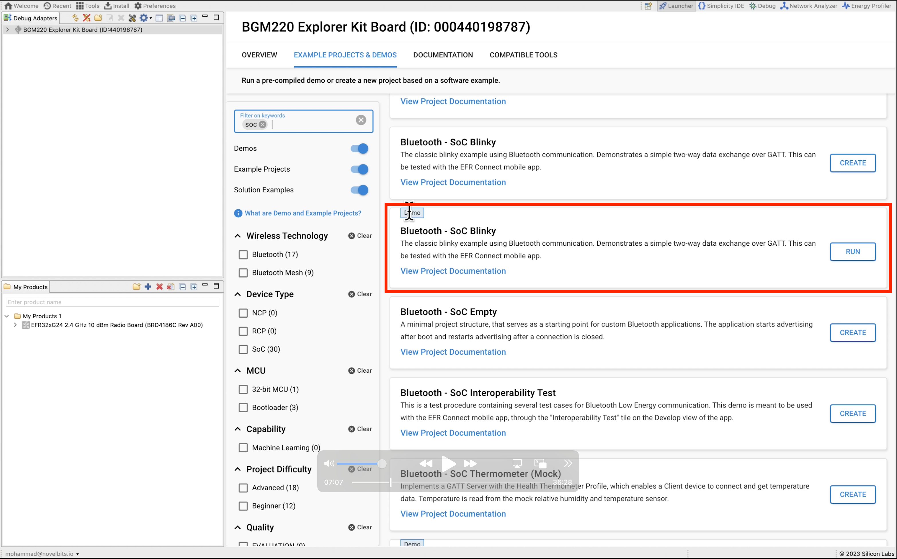 Now, first, we want to run one of the demo applications in order to load the bootloader onto the device. We'll be running the SoC Blinky Demo example: