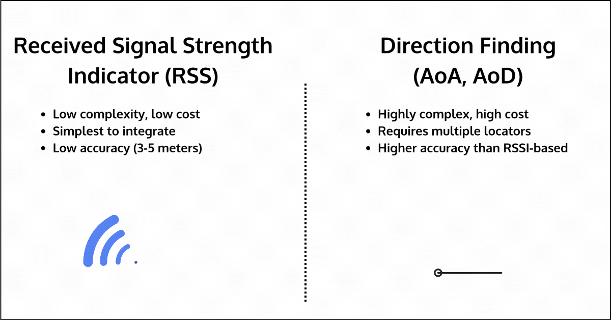 - Direction Finding (AoA/AoD): Direction Finding improves upon RSSI by measuring the angle of arrival or departure of signals to estimate distance. However, it requires additional hardware, such as multiple locators, each with antenna arrays, which can significantly increase cost and complexity. Its accuracy can also degrade in multipath environments, where signals reflect off surfaces before reaching their destination.
