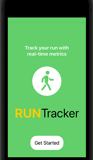 | struct ContentView: View { var body: some View { VStack { Text(“Track your run with\nreal-time metrics”) Image(systemName: “figure.walk.circle.fill”) Text(“RUNTracker”) Button(“Get Started”) { } } } } |