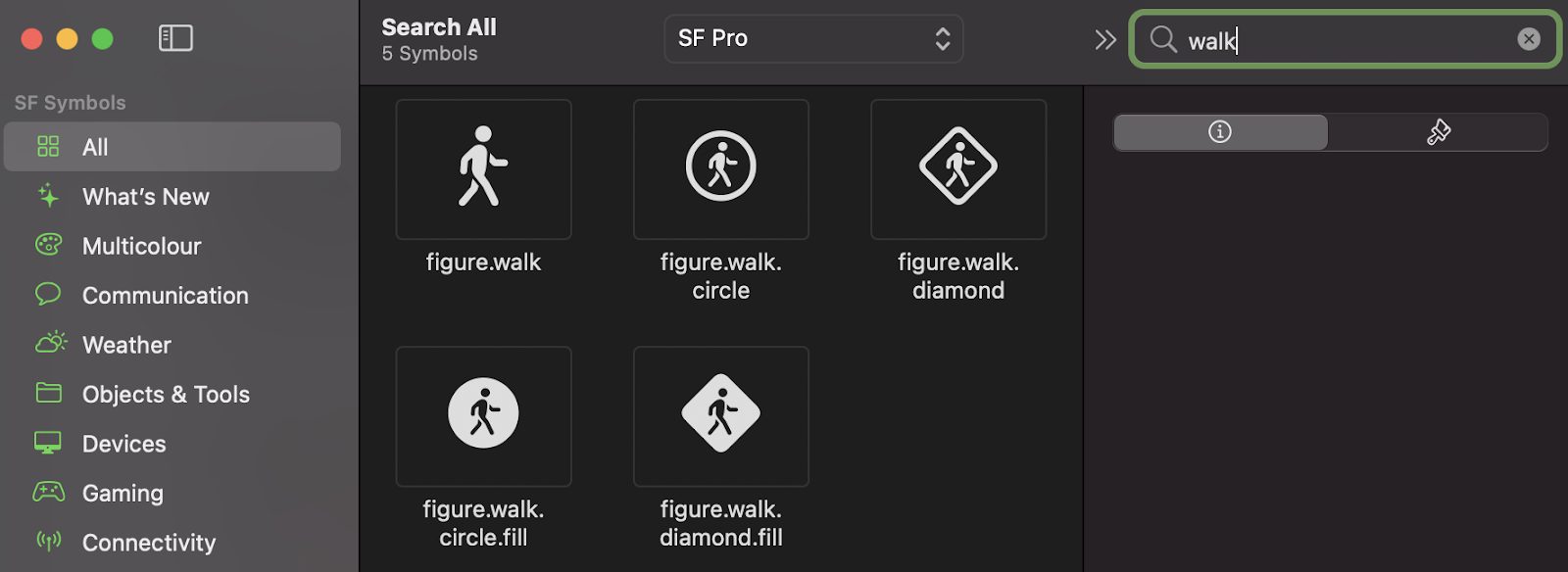 Now open up the SF Symbols app and search for “walk” in the top right bar.