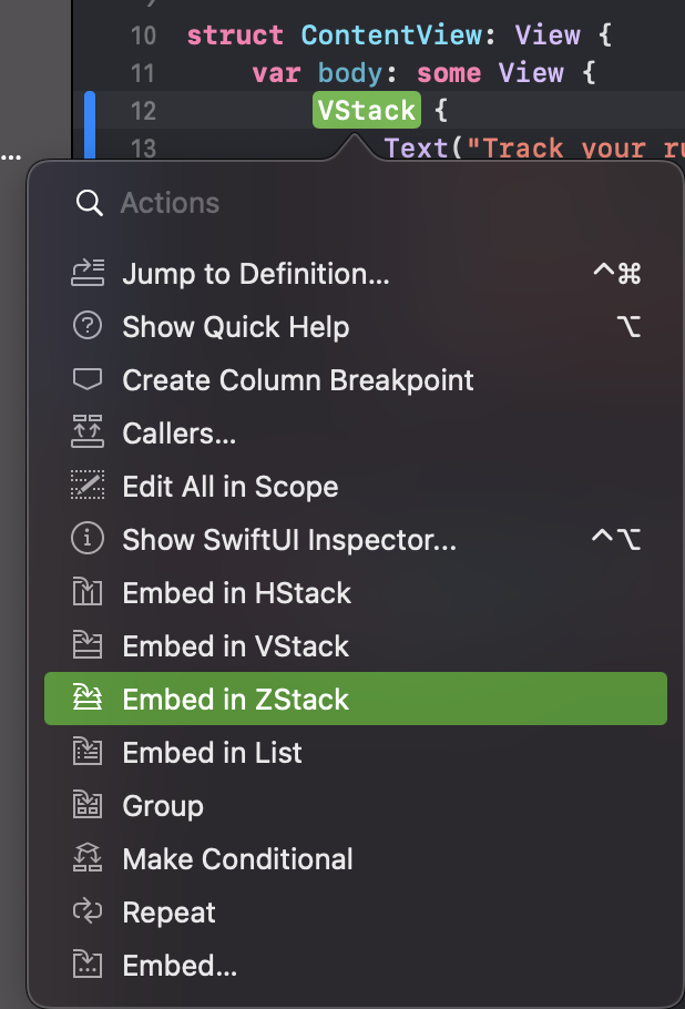 To do this, Cmd+click on VStack in your code and select Embed in ZStack.