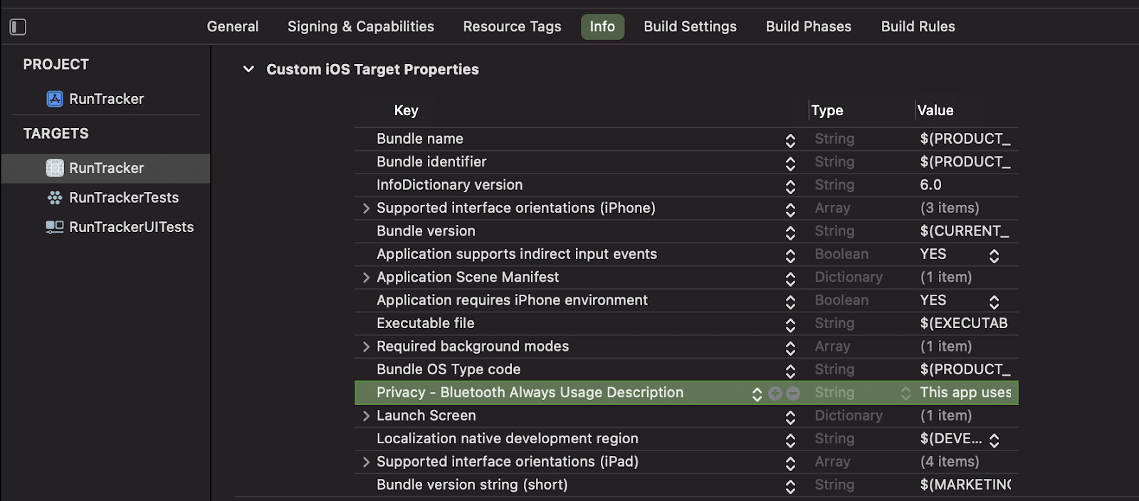 sensors.append(RTSensor(peripheral: peripheral, name: peripheral.name ?? “NoName”, type: sensorType, isConnected: false))What we are doing above is passing the discovered peripheral and its name (or NoName in case there isn’t any), setting the sensor type and its connected flag to false (since we aren’t connected yet).