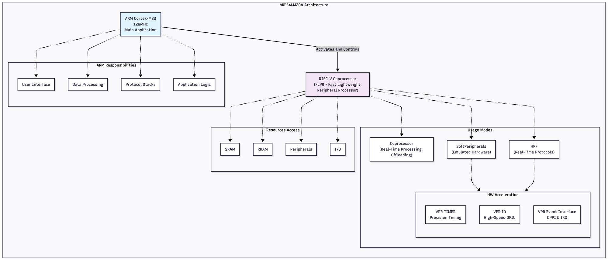 The nRF54LM20A's RISC-V coprocessor is an additional processor optimized for performance, running at 128 MHz alongside the main ARM Cortex-M33. Supervised by the main processor, it provides additional processing capacity and can handle time-critical tasks, offload workload from the main processor, or implement low-level custom protocols. It can also run SoftPeripherals—emulated peripherals that utilize hardware acceleration for I/O.