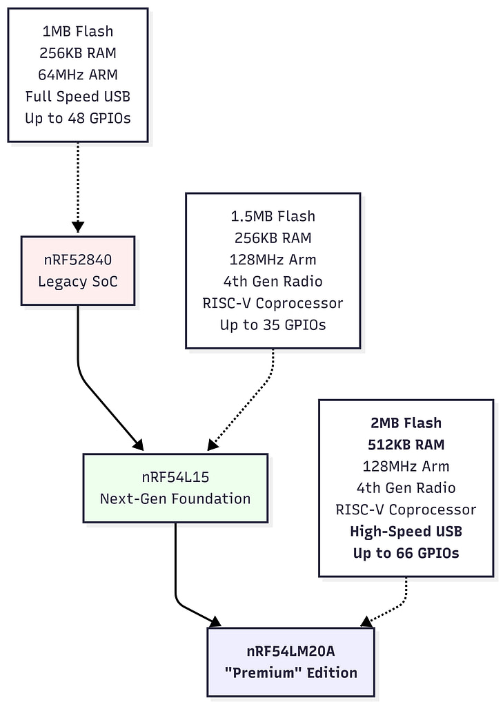 Now, Nordic has expanded their offering with the nRF54LM20A—the bigger sibling to the nRF54L15 that takes everything up a notch. Think of it as the “premium edition” of the lineup. While the nRF54L15 established Nordic’s new direction with its 22nm process and higher power-efficiency design, the nRF54LM20A represents what happens when you remove the constraints and build for developers who need maximum capability.