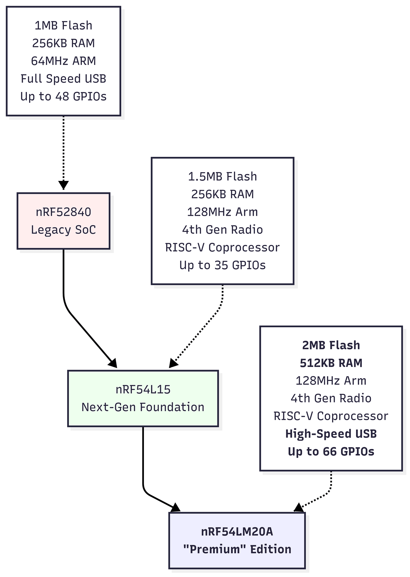 The nRF54L15, as I covered in my previous post, established this foundation with 1.5 MB of non-volatile memory and Bluetooth LE Core v6.0 support. However, developers sometimes require more memory, additional GPIO pins, and enhanced connectivity options for complex applications.
