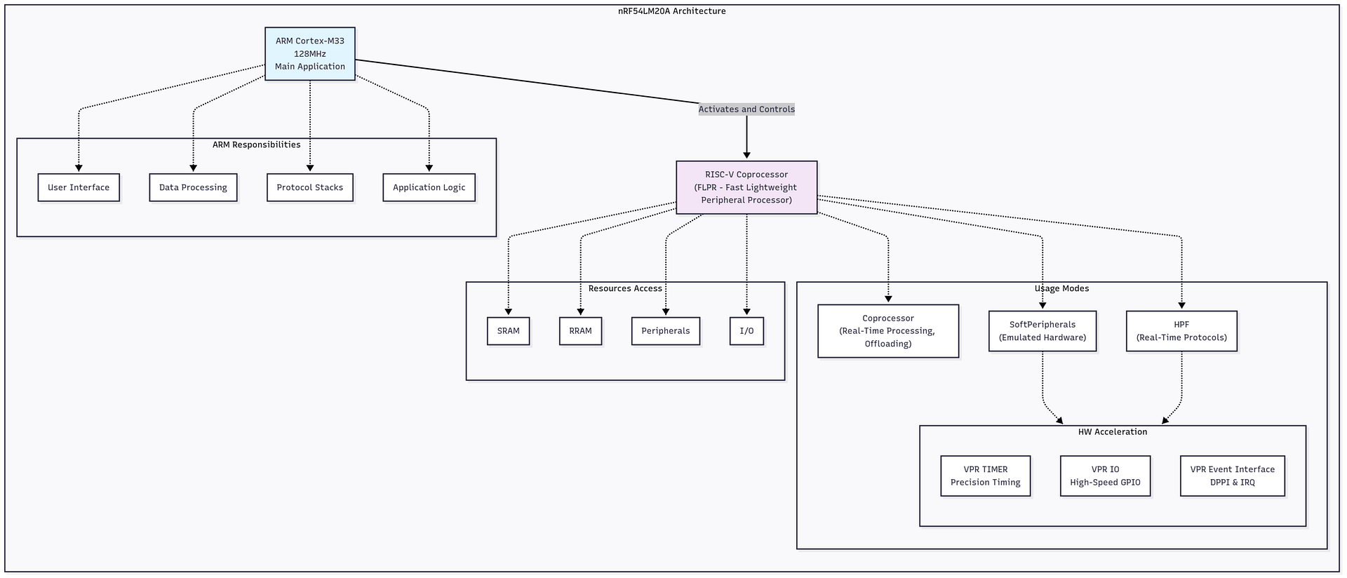 The nRF54LM20A’s RISC-V coprocessor is an additional processor optimized for performance, running at 128 MHz alongside the main ARM Cortex-M33. Supervised by the main processor, it provides additional processing capacity and can handle time-critical tasks, offload workload from the main processor, or implement low-level custom protocols. It can also run SoftPeripherals—emulated peripherals that utilize hardware acceleration for I/O.