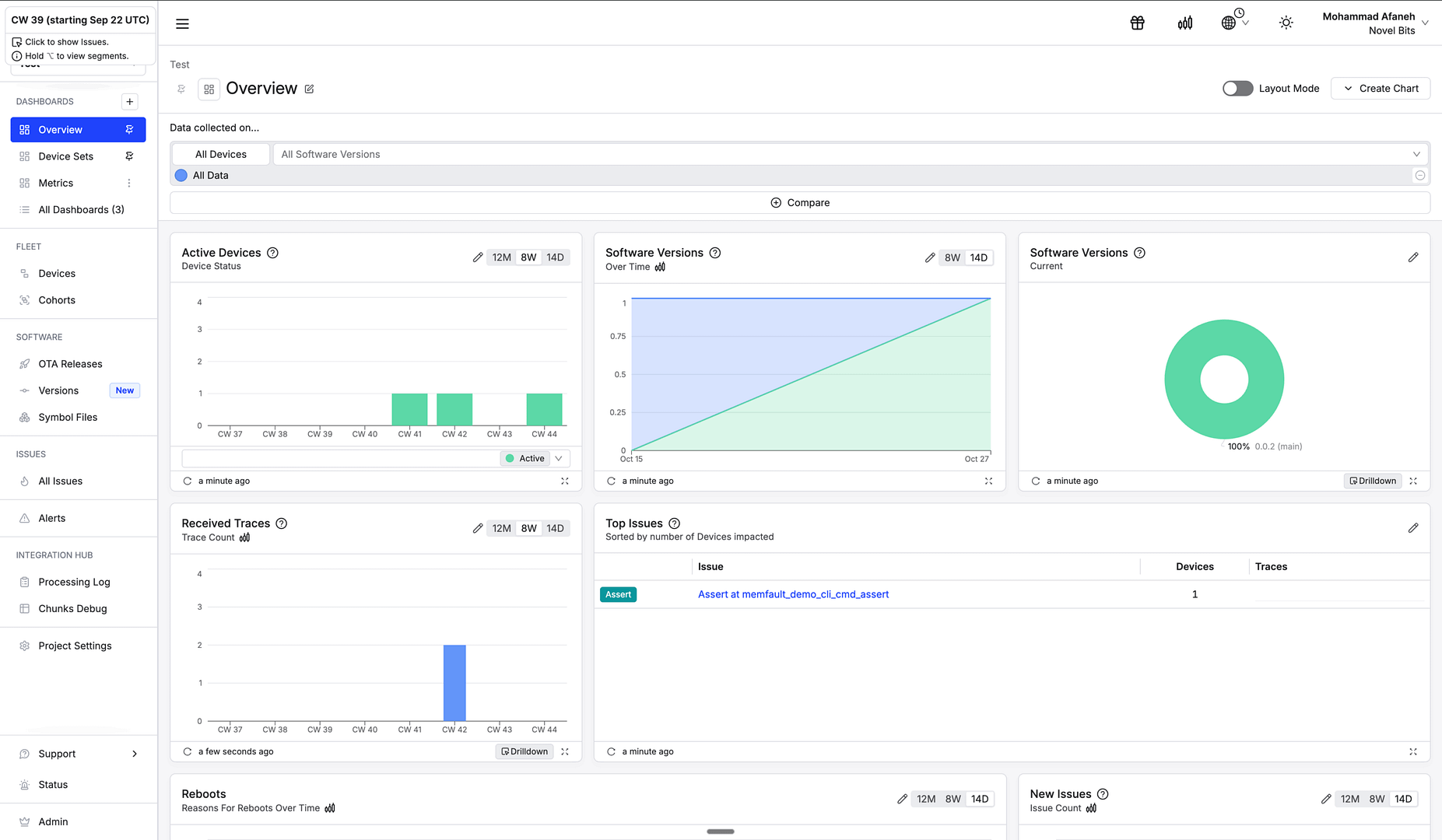 Fleet health monitoring provides continuous visibility. Memfault automatically collects connectivity statistics, battery trends, stability metrics (reboot counts, crash frequency), and memory patterns—viewable per device or aggregated across your fleet, with filtering by firmware version or hardware revision.