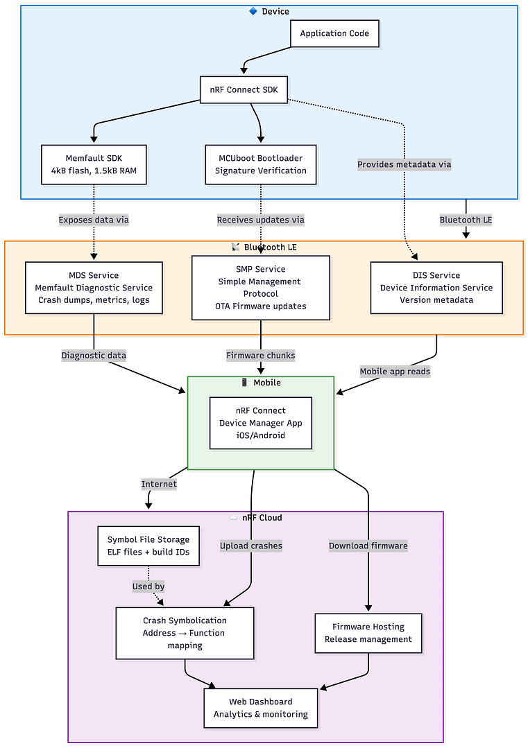At the device level, you run application code on the nRF Connect SDK. You add the Memfault SDK—a lightweight library that adds around 5KB of flash/NVM usage and requires 1.5KB of RAM. This SDK handles crash capture, metric collection, and data packetization.