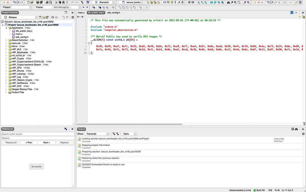 In the project, open the file dfu_public_key.c and replace its contents with the contents of the file we generated above, public_key.c.