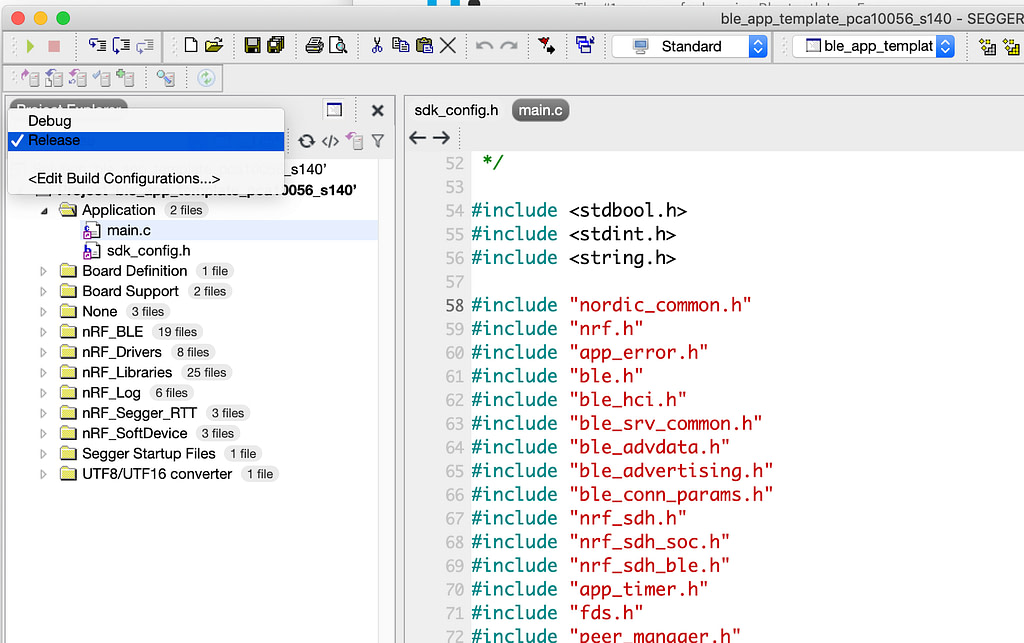 We’ll take the BLE template (PCA10056/nRF52840 development kit) example in the nRF5 SDK and use it as a base for our project. The example can be found at <SDK root>/examples/ble_peripheral/ble_app_template/.