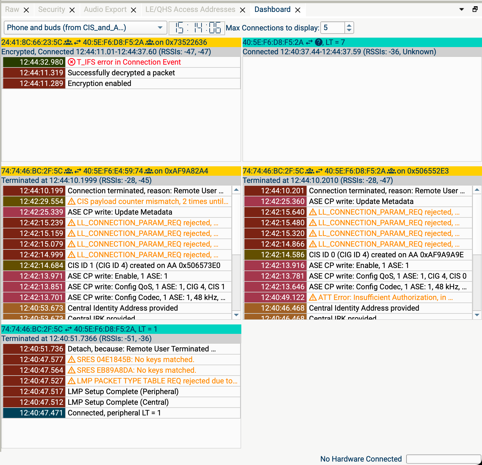 - Multi-Device Capture – Track multiple concurrent BLE connections with timestamps and event correlation.