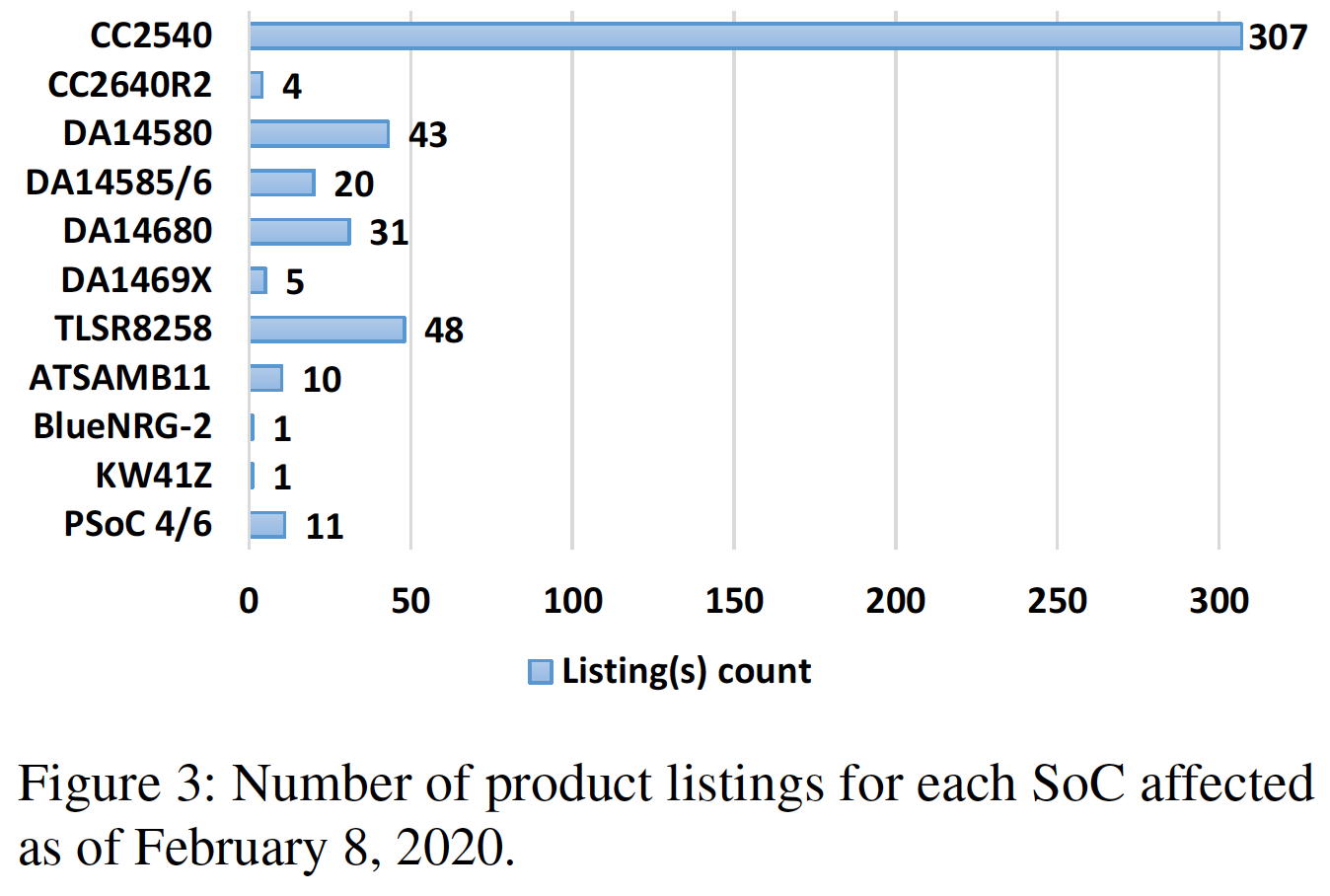 Here’s a graph that shows the total number of product listings using the affected SoCs (as of February 8, 2020) listed by SoC: