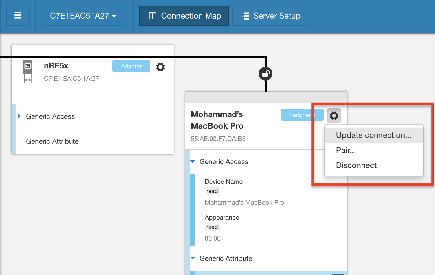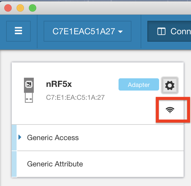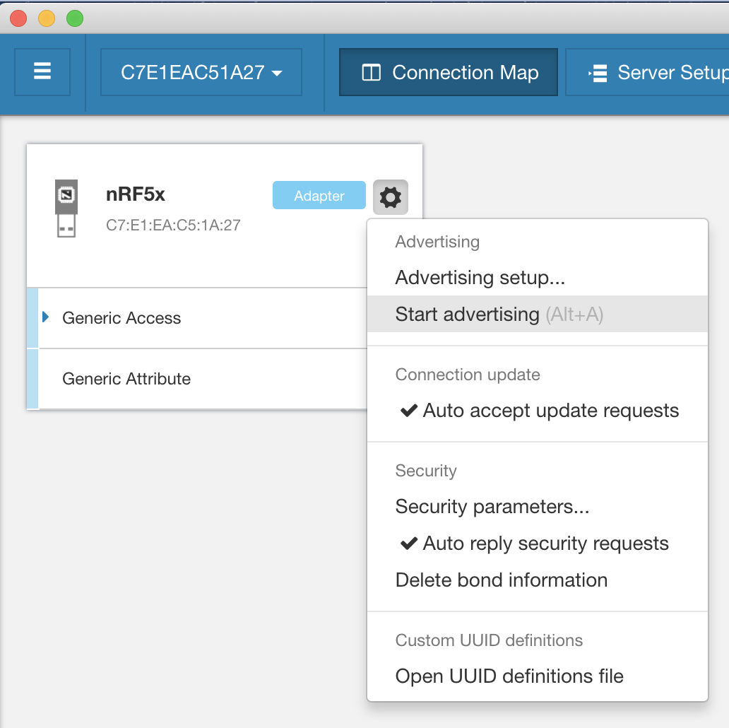 Now you can go back to the Connection Map tab. Click the gear button next to the nRF5u dongle listing, then click on Start advertising.