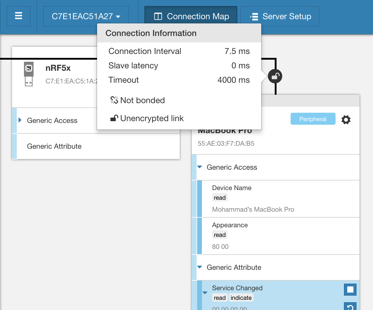 Another feature available is the ability to change the properties of the connection (since the dongle acts in the central role, and hence it controls the parameters) such as: